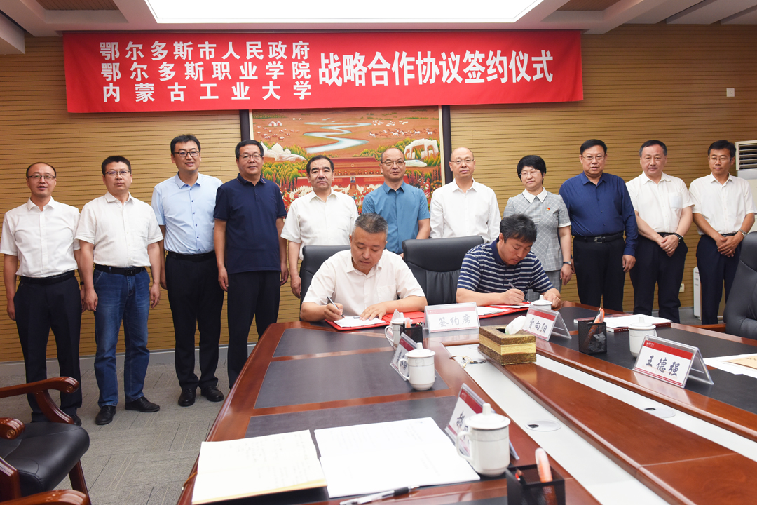 在与会人员的共同见证下,王心宇、姚德签署鄂尔多斯市人民政府与内蒙古工业大学全面战略合作框架协议,鄂尔多斯职业学院院长张建林、韩永全签署鄂尔多斯职业学院与内蒙古工业大学全面合作框架协议。