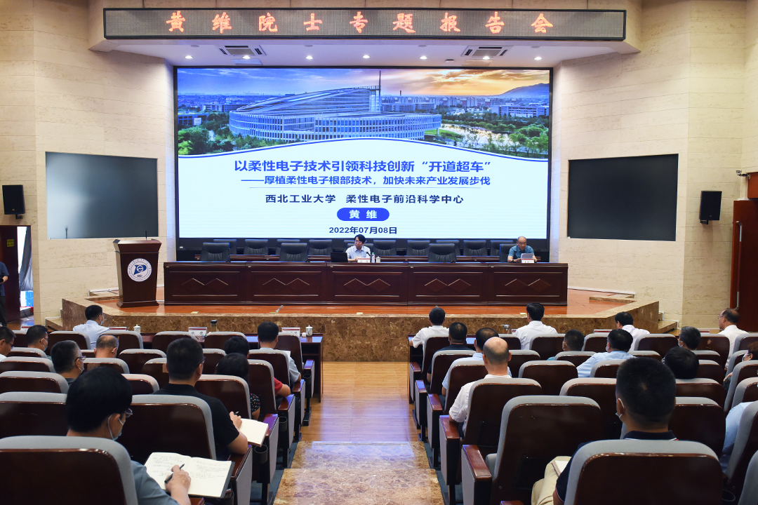 黄维院士从颠覆性创新定义国家未来、柔性电子未来产业的发展、创新团队与近期研发成果、柔性电子产业机遇与挑战等4个方面,作题为“以柔性电子技术引领科技创新‘开道超车’——厚植柔性电子根部技术,加快未来产业发展步伐”的高水平学术报告。黄院士从未来信息产业发展背景入手,对国家颠覆性创新核心领域发展方向进行了说明,并结合团队的科研经历以及近年来取得的各项重大成果,对柔性电子和柔性电子产业进行了详细介绍。他强调,创新自信根植于文化自信,文化自信产生于民族自信,中国电子信息技术发展正处于系统创新和智能引领的重大变革期,柔性电子是智能时代的关键核心科技,深入开展柔性电子领域研究是驱动创新发展的新引擎,是中国在电子信息、智能制造等领域实现“开道超车”的重要战略机遇,我们一定要有创新自信、文化自信、民族自信,要以只争朝夕、舍我其谁的姿态不断追赶超越,为教育强国、科技强国贡献力量。