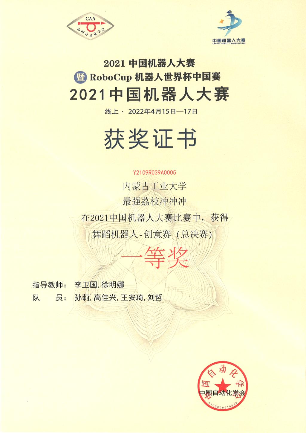 近日,2021中国机器人大赛暨RoboCup机器人世界杯中国赛中国机器人大赛总决赛成绩公布,由我校工程训练教学部李卫国教授、徐明娜高级实验师指导,孙莉(机械工程学院工设19-1班)、高佳兴(航空学院飞制20-1班)、王安琦(机械工程学院机电20-1班)、刘哲(机械工程学院工设19-2班)等4位同学组成的团队获得舞蹈机器人专项赛一等奖。