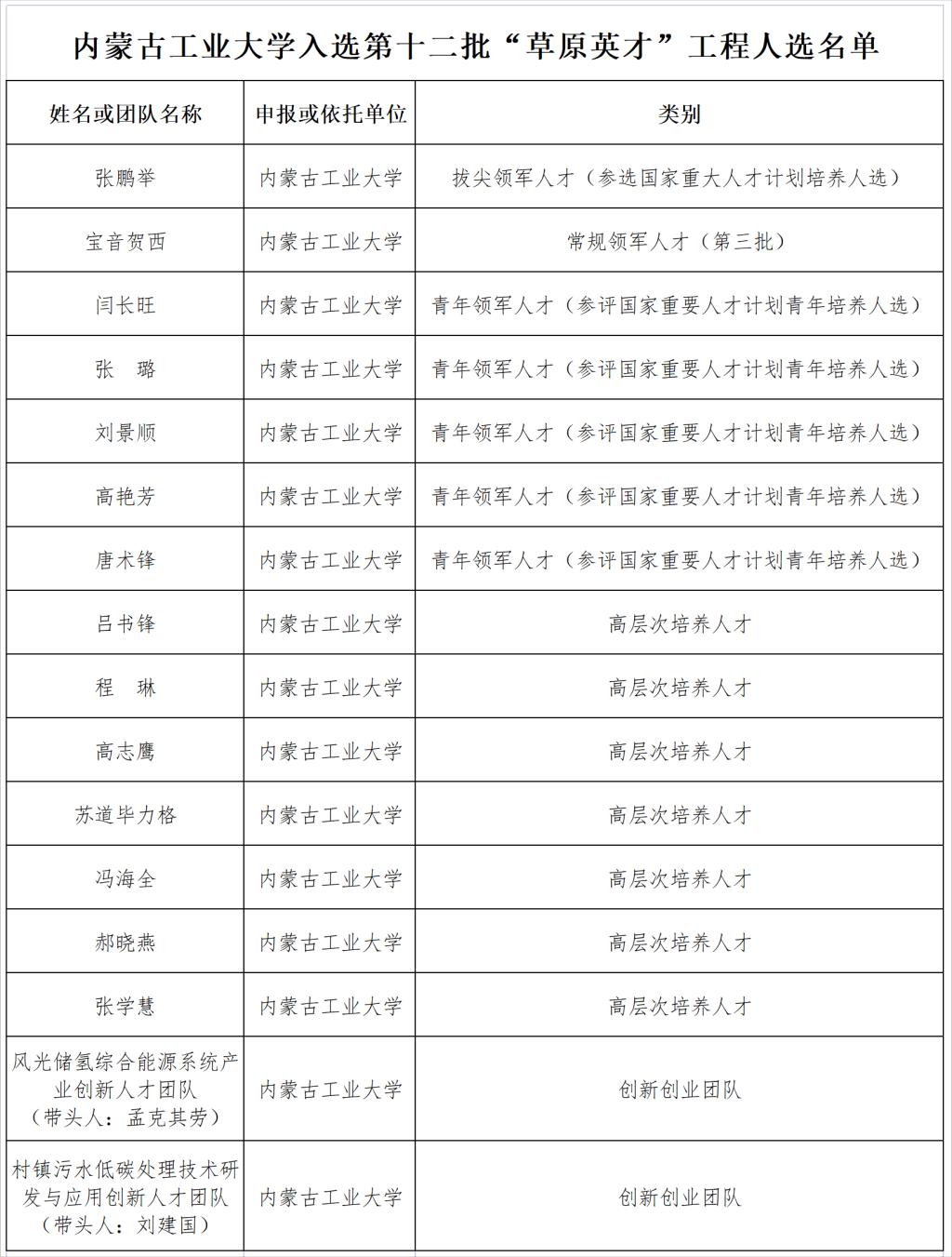 近日,自治区党委人才工作领导小组办公室公示第十二批“草原英才”工程评审结果,经申报、审核、初评、终评等环节,我校共14名教师和2个团队入选,其中建筑学院张鹏举入选拔尖领军人才,副校长宝音入选常规领军人才(第三批),学报编辑部闫长旺、经济管理学院张璐、科研处刘景顺、化工学院高艳芳、机械工程学院唐术锋入选青年领军人才,理学院吕书锋、化工学院程琳、能源与动力工程学院高志鹰、理学院苏道毕力格、机械工程学院冯海全、人文学院郝晓燕、经济管理学院张学慧入选高层次培养人才;能源与动力工程学院孟克其劳负责的风光储氢综合能源系统产业创新人才团队、能源与动力工程学院刘建国负责的村镇污水低碳处理技术研发与应用创新人才团队入选创新创业团队。