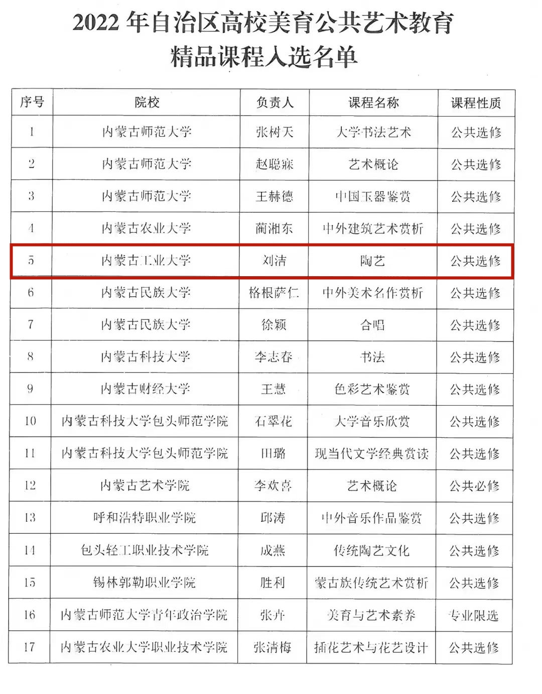 近日,教育厅公布自治区高校美育公共艺术教育精品课程评选结果,我校建筑学院刘洁老师主讲的《陶艺》课程入选。