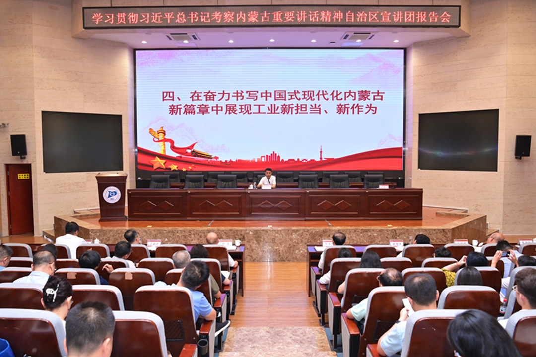 王金豹以“牢记嘱托 真抓实干 奋力书写中国式现代化内蒙古新篇章——学习贯彻习近平总书记考察内蒙古重要讲话精神”为题,从“深切感悟习近平总书记对内蒙古的关心厚爱”“深切领会习近平总书记重要讲话的丰富内涵和实践要求”“以办好两件大事为牵引推动习近平总书记重要讲话精神落地落实”“在奋力书写中国式现代化内蒙古新篇章中展现工业新担当、新作为”4个方面,全面系统解读了习近平总书记考察内蒙古重要讲话精神的核心要义、丰富内涵和实践要求。