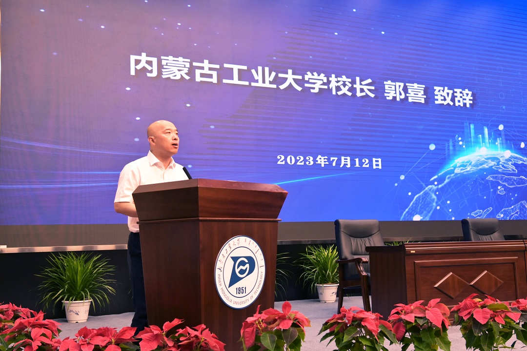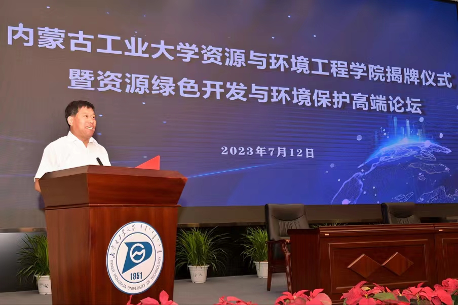 校长郭喜致辞。他表示,组建资源与环境工程学院是学校深入贯彻落实习近平总书记考察内蒙古重要讲话精神的生动实践,对服务自治区经济社会发展大局、促进学校高质量发展意义重大。学院目前已组建一支高层次教师队伍,建成3个硕士学位点、4个省部级科研平台,为下一步发展奠定了坚实基础。他希望资源与环境工程学院始终坚持立德树人根本任务,明确办学定位,推进科教产深度融合,强化有组织科研攻关,加强高水平人才队伍建设,努力成为自治区乃至中国北方资源环境领域人才支撑和科技供给的重要基地,为书写中国式现代化内蒙古新篇章作出新的更大贡献。