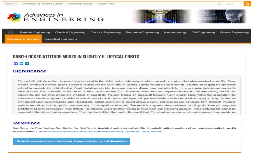 近日,我校校长宝音教授团队在非线性动力学领域国际著名学术期刊《Communications in Nonlinear Science and Numerical Simulation》发表论文“ Analytical solutions and stability of periodic attitude motions of gyrostat spacecrafts in weakly elliptical orbits”被全球著名科技媒体机构“工程进展”(Advances in Engineering,AIE)遴选为“关键科学文章”,并予以详细报道。