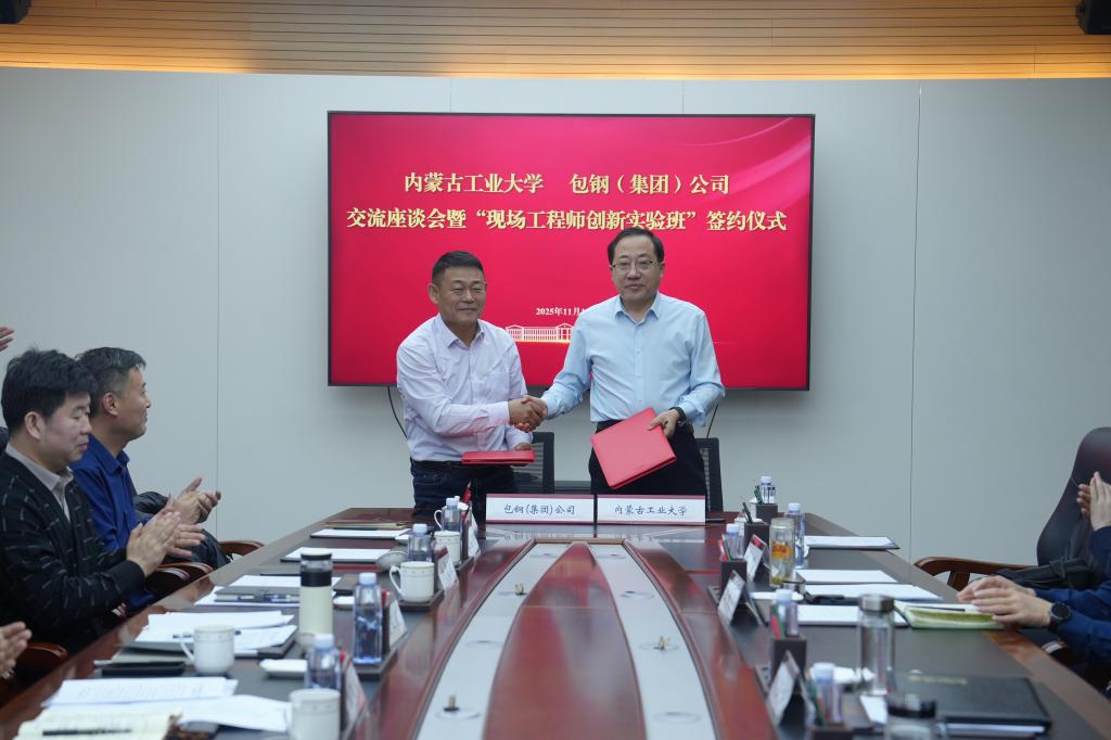 会上,双方围绕“稀土材料卓越工程师学院”建设、“现场工程师创新实验班”等内容深入交流,并签署《内蒙古工业大学与内蒙古包钢钢联股份有限公司“现场工程师创新实验班”联合培养合作协议》。