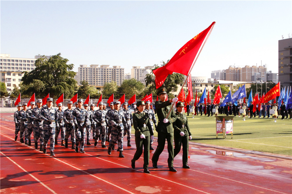 机械工程学院的同学为全校师生献上了他们精心编排的开场舞《辉煌七十年,筑梦新时代》。350名同学整齐划一地舞动红旗,随着队列变换,组成“工大”字样和齿轮形状。青春的气息奔腾流淌在绿茵场上,传递着青年学子喜迎新中国七十华诞的激动心情。