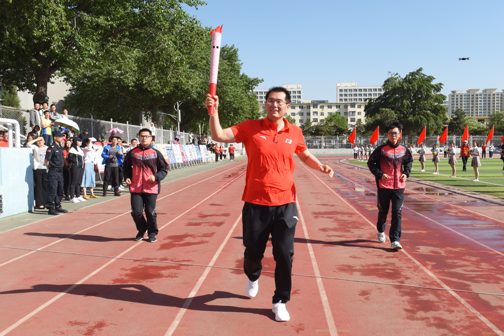 运动员列队完毕的短暂安静之后,裴承慧代表一线教师,手持火炬出现在体育场跑道的西北侧,开始第一棒的火炬传递。随后,火炬在科研教师代表韩永全、后勤工作人员代表郭宏波、思政教师代表李慧、小平创新团队学生代表张美玉、参加运动世界校园学生代表郭昊旗、行政工作人员代表姜兴双、学生社团代表李晓旭和体育教师代表刘威之间传递,绕场一周后到达主席台正面,“点燃”了主火炬台。红丝绸火焰雀跃飞舞,祝愿内蒙古工业大学各项事业蒸蒸日上、再创辉煌。