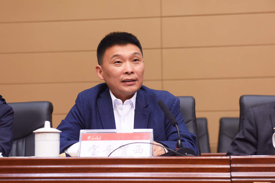 宝音贺西作表态发言。他表示,感谢自治区党委的肯定以及自治区党委组织部、教育厅的厚爱,坚决服从组织安排,坚决拥护组织的决定。清华大学和内蒙古工业大学有着深厚的感情,能够回到家乡,来到内蒙古工业大学工作,深感使命光荣、责任重大,同时也充满信心。在今后的工作中,将以习近平新时代中国特色社会主义思想武装头脑,树牢“四个意识”,坚定“四个自信”,把握“两个确立”,践行“两个维护”,坚决做到廉洁自律、为人师表。尽快融入学校的新环境、新角色,尽心尽责,不负重托,认真落实自治区上级部门和学校党委的各项决定,学习借鉴先进办学理念,助推办学实力提升,为学校高质量发展作出贡献。