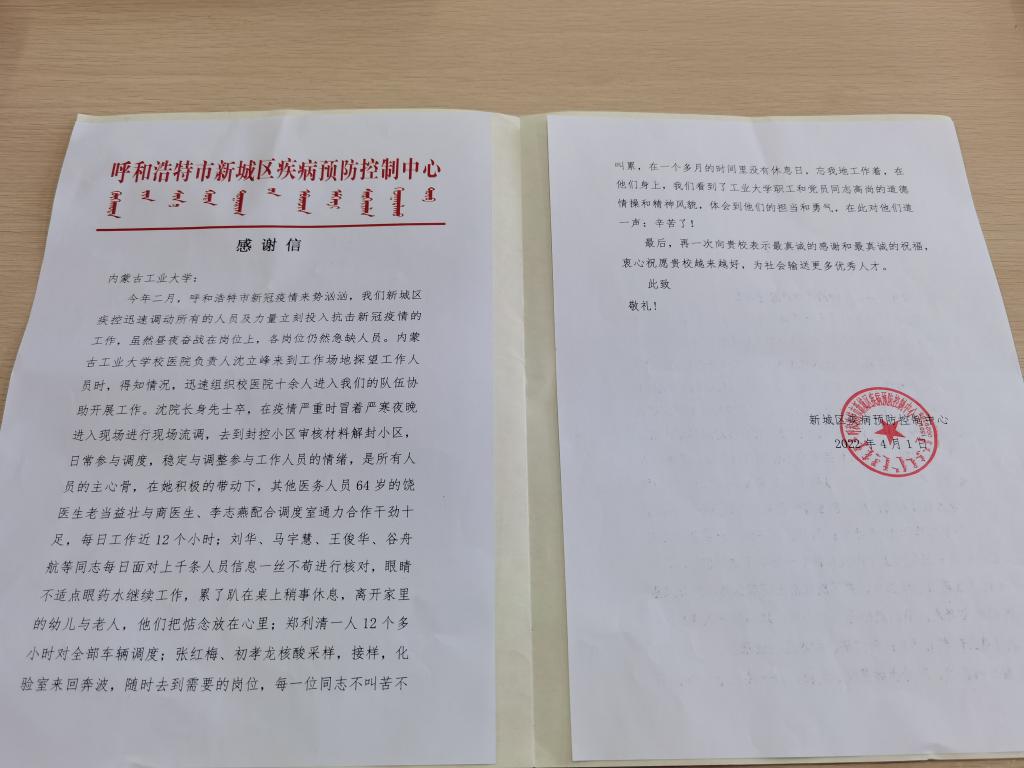 近日,呼和浩特市新城区疾病控制预防中心向我校发来感谢信,就校医院院长沈立峰等十余名医务人员支援属地新冠肺炎疫情工作表示感谢。