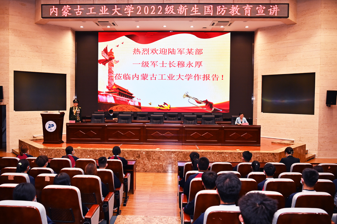 为进一步弘扬爱国主义精神,增强学生国防意识,纪念“九一八”事变91周年,9月18日、19日,由校党委宣传部、党委学生工作部(学生工作处、党委武装部)主办的“建设亮丽内蒙古 共圆伟大中国梦”形势政策报告会暨2022级新生国防教育宣讲活动分别在新城、金川两校区举行。原陆军某部一级军士长、直升机空中机械师穆永厚作专题报告。学校有关部门负责人、2022级新生代表聆听报告会。校党委学生工作部(学生工作处、党委武装部)部长(处长)金燕飞、党委宣传部副部长董小倩分别主持报告会。