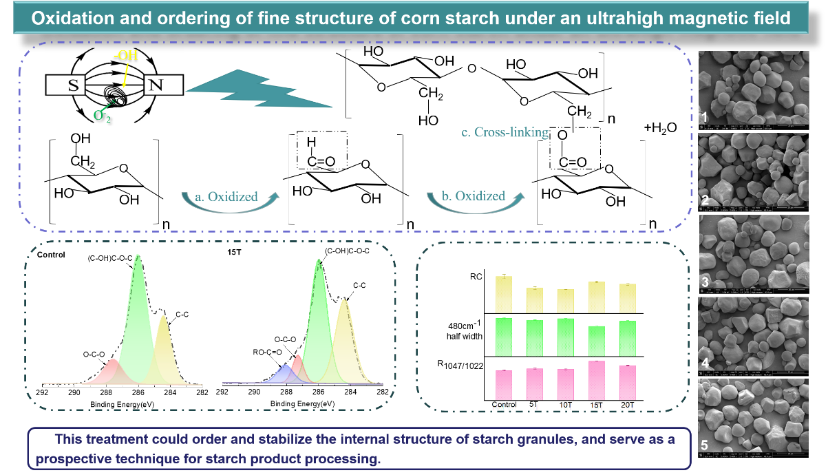 近日,我校刘培玲副教授课题组与西安交通大学研究人员在国际期刊《Carbohydrate Polymers》(中科院高分子科学、化学类一区TOP期刊,影响因子10.723),联合发表题为“Oxidation and ordering of fine structure of corn starch under an ultrahigh magnetic field”的学术论文,揭示了强磁场对淀粉精细结构的影响。