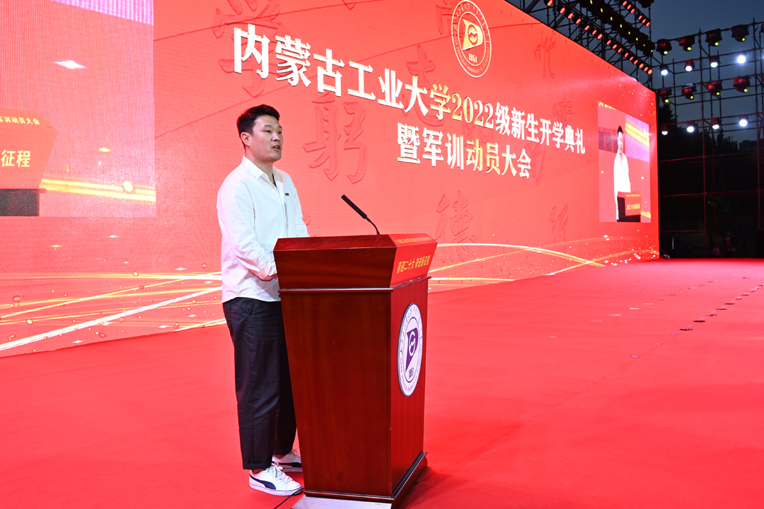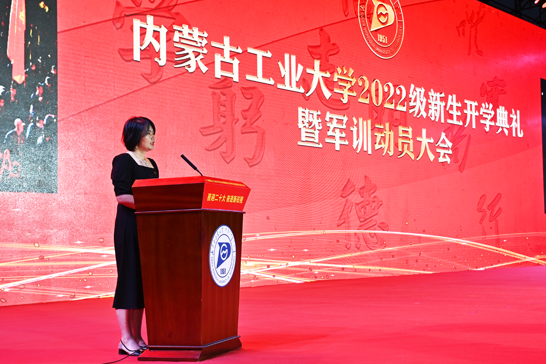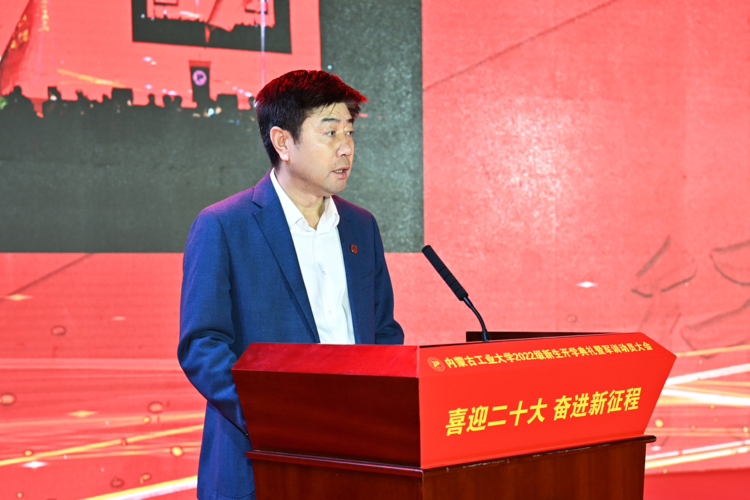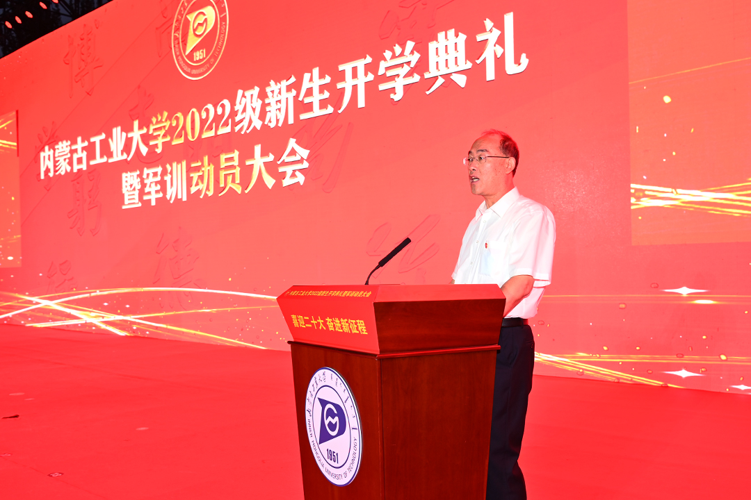 孙国权发表了题为《立志明德 笃行不怠》的讲话,为2022级新生讲授“开学第一课”。他说,内蒙古工业大学建校至今,始终以“培养内蒙古地区工业化建设亟需人才”为己任,与国家、自治区发展同频共振,用工业报国的志气、扎根北疆的骨气、创新发展的底气,奋发向上、砥砺前行,并形成了在一代代内工大人身上赓续传承、历久弥新的“博学躬行、尚志明德”校训和“唯实尚行”校风。70多年来,学校培养了近20万名优秀学子,他们奋斗在大江南北,工作在各行各业,许多已成为大中型企业的领军人物和技术骨干、高校或科研院所的知名专家学者、重要岗位上的党政领导干部,期待同学们也像众多优秀校友一样,成为国家之栋梁、社会之精英。