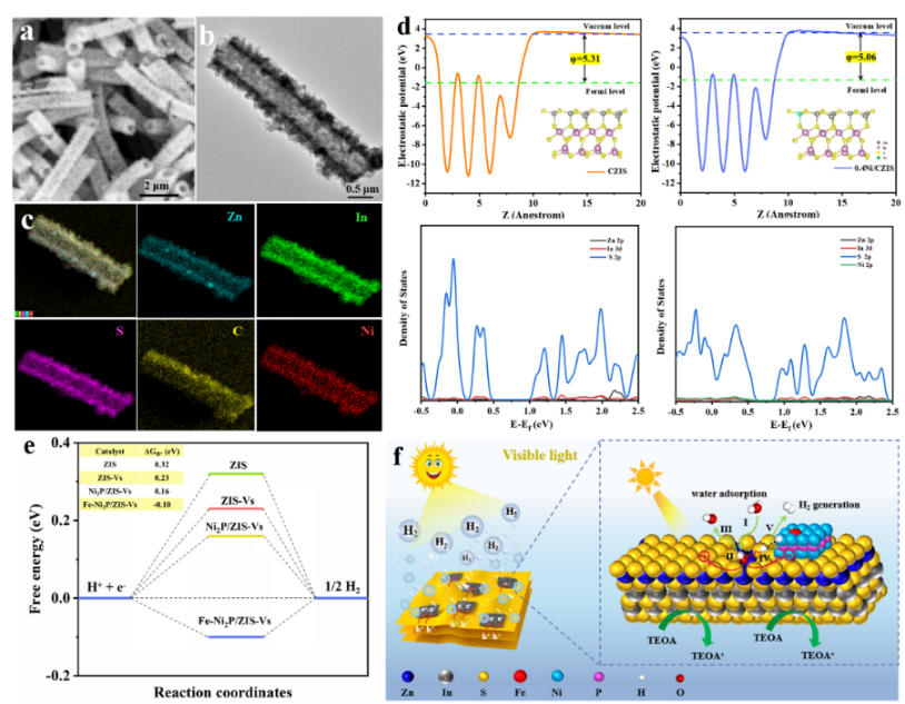 本研究通过溶剂热自组装技术巧妙地设计并获得2D/2D Fe-Ni2P/ZnIn2S4-Vs材料。其中,S缺陷可以作为电子陷阱富集电子延长载流子寿命,同时丰富的S缺陷作为P原子的靶点有利于Fe-Ni2P在ZIS-Vs表面原位生长,两相之间紧密的界面有利于电荷定向转移。模拟计算结果证实,Fe掺杂取代部分Ni位点,在改变Ni的局部配位环境的同时,其d带中心位置也进一步得到优化,降低析氢反应中间态的吉布斯自由能,解决了ZnIn2S4光催化材料载流子复合严重的问题,有效提升析氢反应速率。
