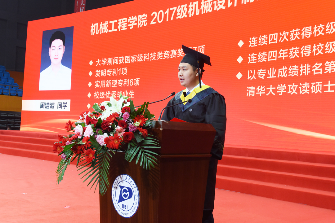 机械工程学院周浩波同学、材料科学与工程学院陈芙蓉教授分别代表2021届毕业生和在岗教师发言。退休老教师刘志璋教授、优秀校友张福胜也分别寄语同学们,勉励大家不忘母校和师长的谆谆教诲,脚踏实地,不懈奋斗,创造美好的未来。