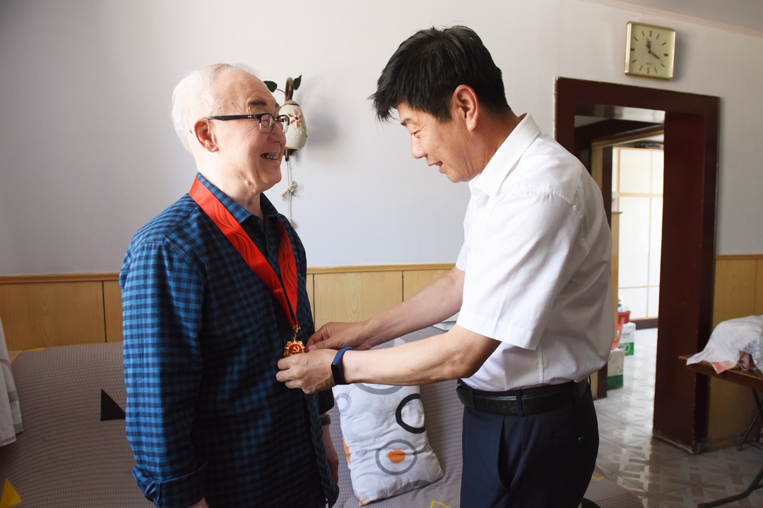 今年93岁的离休干部杨文忠,1945年加入中国共产党,是一位有着75年党龄的老党员。校长姚德为老人颁发佩戴了“光荣在党50年”纪念章,详细询问老人的生活、身体等情况,了解到他的战斗、工作经历后,共同回顾了艰苦岁月中的拼搏奋斗,畅谈新时代的发展变化。姚德表示,要学习老同志艰苦奋斗的精神,赓续光荣传统,汲取前行力量,大力推动学校各项事业发展,祝愿老人家健康长寿。