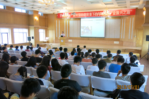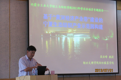 7月1日,绍兴文理学院纺织服装学院段亚峰教授应轻工与纺织学院邀请,在金川校区电力大楼报告厅作了题为《基于“黄河经济产业带”建设的宁夏生态纺织产业示范园构建》的学术报告。副院长佐同林主持报告会,相关专业教师和学生聆听报告。